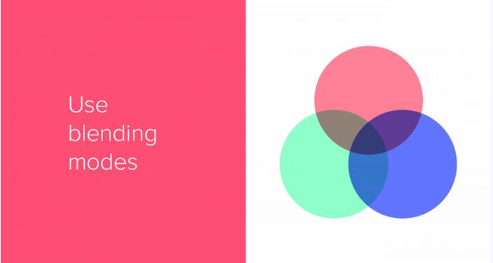 如果你能善用混合模式,就能创造出令人着迷的配色方案。通过简单的叠加两个色块,选择“Multiply”(乘法)混合模式,就能得到匹配的第三种色彩。在白色背景上,我们还能通过调整透明度来快速调整色彩的明暗。不过我始终觉得在黑色背景上来调整色彩更有意思,搭配混合模式来探索色彩的可能性,总能创造新的搭配。这种同色彩的交互方式,为许多经验丰富的设计师所使用。