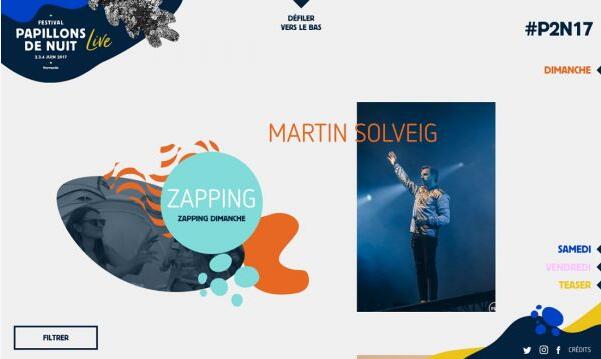 如下图, 这个网站活动主题就很好地借助波纹和曲线来强调。网页中,基于波纹和曲线所构成的元素各司其职,左上角的波纹元素带有动效,你不会忽略其中所承载的主题。中间多重波纹构成的Zapping 元素和矩形的 Martin Solveig 图片构成对比,组成了视觉主体,而右下角流动的波纹则承载着用户可能感兴趣的社交媒体链接。